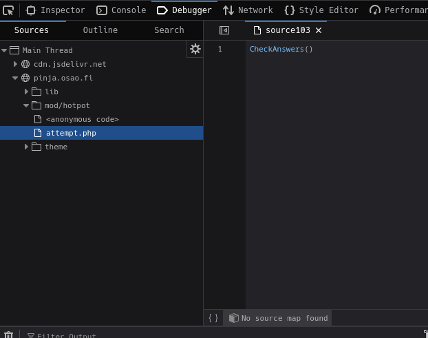 As you can see, the developers clearly have an eye for design. For this one, I decided to check out the code first. I used inspect element on the "Tarkista" (check answers) button, which showed me that it called a CheckAnswers function. Now, I'm not exactly a webdev, so I clicked on the button to show me to the source of the event.